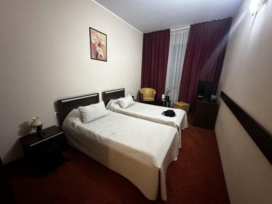 Pretty good hotel for the money. We stayed here for 1 night and were satisfied. The room is clean, has air conditioning, a refrigerator with ... Więcej Pretty good hotel for the money. We stayed here for 1 night and were satisfied. The room is clean, has air conditioning, a refrigerator with a free minibar. Clean bed and towels. There is a minimal set of personal hygiene products. The breakfast is also not bad - everything you need was there, and as soon as the food ran out, freshly cooked food was brought. There is a parking lot behind the hotel, which is also included in the price of accommodation. On the 1st floor there are rooms for people with disabilities.