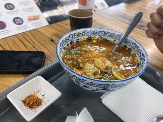 Ресторан Ramyunbaby вразив своїм супом том ям. Бульйон був насиченим, ароматним і пікантним, з ідеально ... Więcej Ресторан Ramyunbaby вразив своїм супом том ям. Бульйон був насиченим, ароматним і пікантним, з ідеально збалансованим кисло-солодким смаком. Поєднання спецій і свіжих інгредієнтів робило кожен ковток справжнім задоволенням. Безумовно, це одне з найкращих місць, де можна скуштувати том ям.